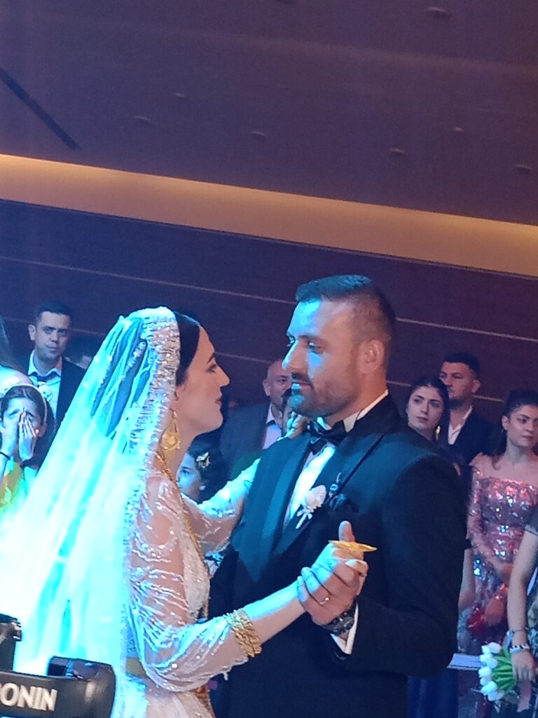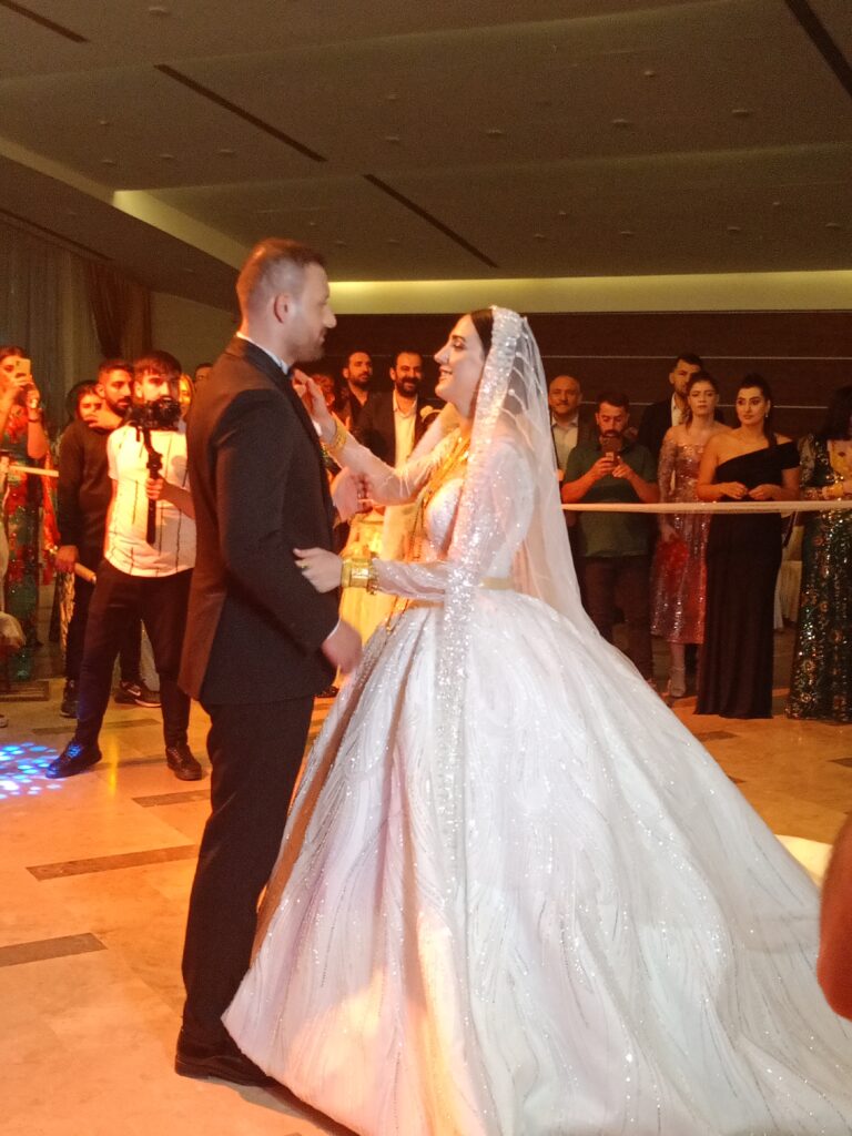 Bölgede sembolü haline gelmiş ve nostaljiyi yaşatan davul-zurna (Davulcu Cemil ve ekibi) eşliğinde salona giriş yapan gelin ve damada ailenin gençleri davetlilerle beraber alkış tufanı ile kadınlar da çektikleri zılgıtlarla eşlik etti. Salon ortasında oluşturulan çemberde damat Ferhat gelinin duvağını açtıktan sonra ilk dansını yaptı. Gelin ve damadın dansına davetliler dans ve alkışlarla eşlik etti.