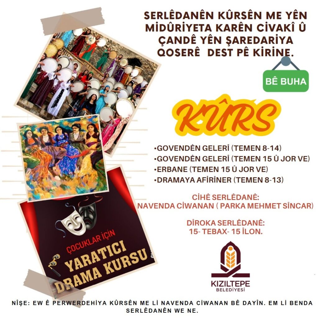 Kızıltepe Belediyesi Kültür ve Sosyal İşler Müdürlüğü’nün çocuk ve yetişkinleri sanatla buluşturmak amacıyla kültür ve sanat kurslarının yeni dönemin kayıtlarını almaya başladı. Kızıltepe Belediyesi Gençlik Merkezi’nde verilecek kurslar çok geniş bir yelpazede olacak. Sanatın ve eğitimin her zaman destekçisi olan Kızıltepe Belediyesi’nin ücretsiz olarak vereceği kurslara katılacak vatandaşlar, yetişkin ve çocuk kategorileri olmak üzere üç branşta eğitim alma imkanı yakalayacak. 8 – 14 yaş aralığı ile 15 yaş ve üzerini kapsayacak iki kategoride halk oyunları, 15 yaş ve üzeri gençler için erbane ve 8-13 yaşları arasında çocukları kapsayan yaratıcı drama kursları için başvurular alınacak. Çocuk ve yetişkinler için verilecek olan kurslar 15 Ağustos’tan itibaren kayıt yaptırabilecek. Kayıtlar 15 Eylül’de sona erecek.