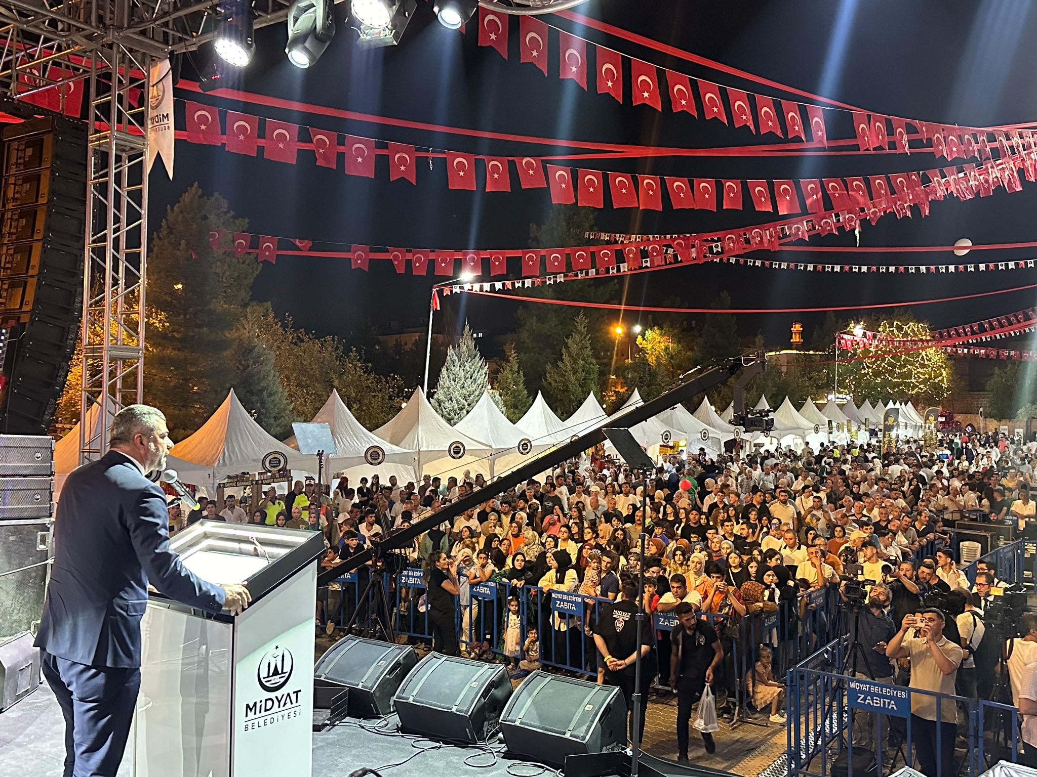 Konuşmasının devamında, “Midyat’a bu perspektiften bakıldığında sanatın, kültürün, sosyoloji ve dini hayatın önemli bir durak noktasında olduğumuzu göreceğiz. Binlerce yıllık maziye sahip gümüş işlemeciliğinin en güzel örneklerini Midyat’ta görmekteyiz. Telkari sanatının anavatanı Midyat’tır ve geleneksel üretim hala bütün haşmetiyle devam etmektedir. Ülkemizin ilk ve tek telkâri müzesi Midyat’ta değerli belediye başkanımız Veysi Şahin’in gayretleriyle açılmıştır. Keza taş işçiliğinin de en güzel örneklerini tarihi binalarda görmek mümkündür. Bu sebeple Midyat, sanat ve zanaat temelinde büyüyen bir vizyona sahiptir. UNESCO adayı, tarihin emaneti, güvenlik ve huzur açısından her dönemin istikrar adası ve yukarı Mezopotamya havzasının nazlı çiçeği Midyat’ta düzenlenen kültür ve sanat festivali ile Midyat’ın sahip olduğu değerleri, güzellikleri ve zengin kültürel mirası yeniden hatırlama imkanı bulacağız. 3. Uluslararası Midyat kültür ve sanat festivaline katılan değerli sanatçılarımıza, festival alanında açtıkları standlarda geleneksel sanatlarını, yöresel ürünlerini ve Midyat’ın güzelliklerini sergileyen ustalarımıza, çiftçilerimize, esnafımıza, hanım kardeşlerimize kısacası yüreğinde Midyat sevgisi taşıyan tüm misafirlere bu coşkuya ortak oldukları için gönülden teşekkür ediyorum. Ve son olarak da; bu kıymetli ve büyük organizasyonu düzenleyen Midyat Belediye başkanımız Veysi Şahin’e ve Midyat Kaymakamımıza çok teşekkür ediyorum. Festivale katılan başta siz kıymetli Midyatlı kardeşlerim olmak üzere, yurt dışından ve çeşitli şehirlerden gelerek bu meydanı coşturan misafirlerimize keyifli ve eğlenceli vakitler geçirmenizi diliyor; selam, saygı ve muhabbetlerimi sunuyorum.” dedi