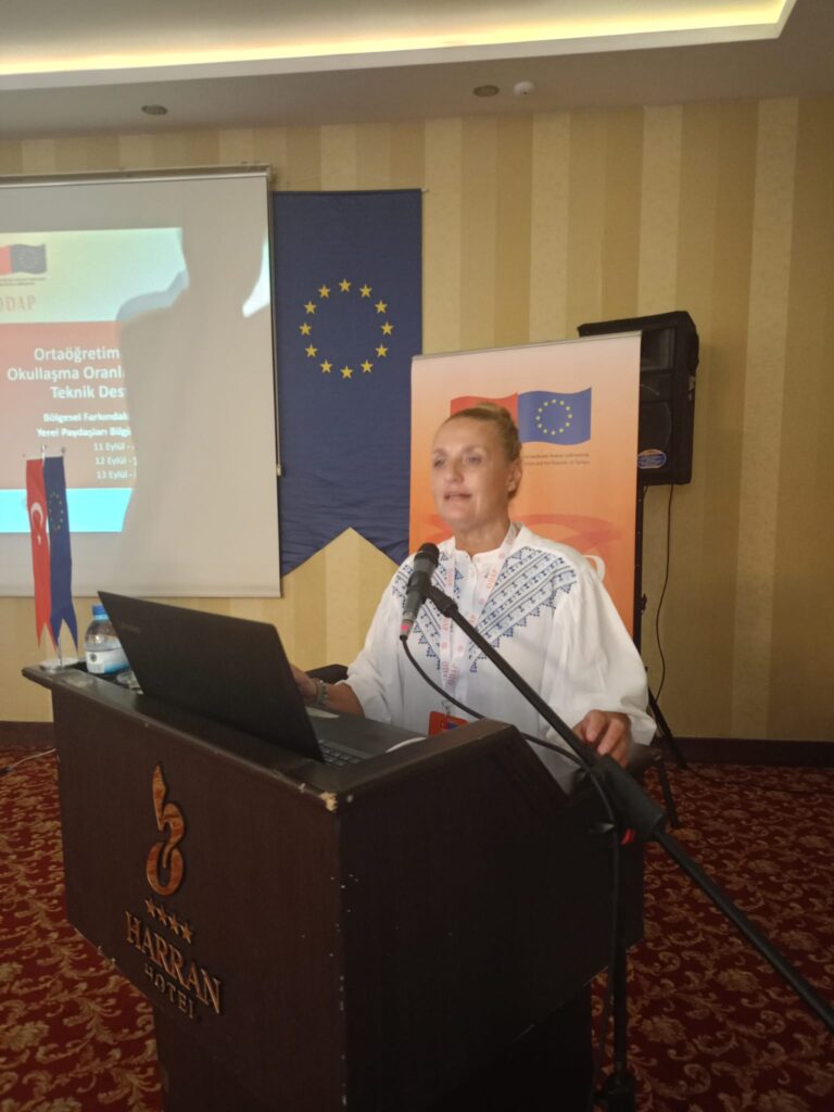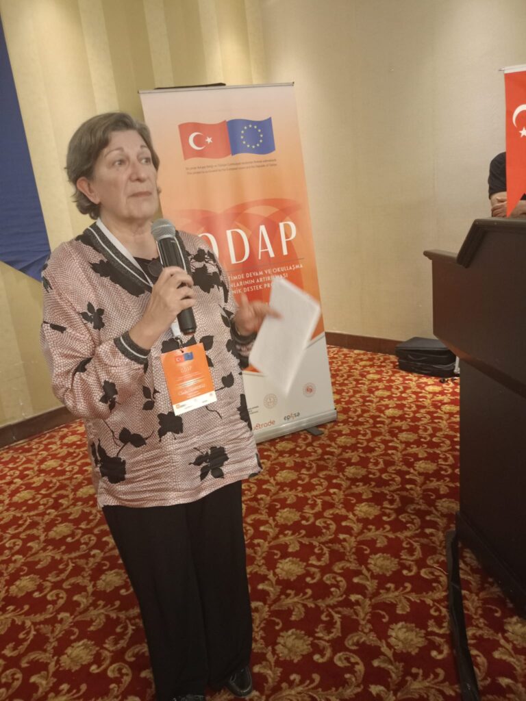 Daha sonra projenin Kilit Uzmanlarından Eğitimci Cleofe MC Guardigil slayt eşliğinde Erken Okul Terki ile mücadeleye ilişkin AB Politikaları ve Uygulamasına kısa bir giriş konulu birinci oturumu sundu. Bayan CLeofe, istatistiki verilerle Türkiye’nin AB üye ülkelerle ve aday ülkelerle konuyla ilgili karşılaştırmasını yaptı. Sunum bitiminde katılımcılardan gelen sorulara cevap verdi.