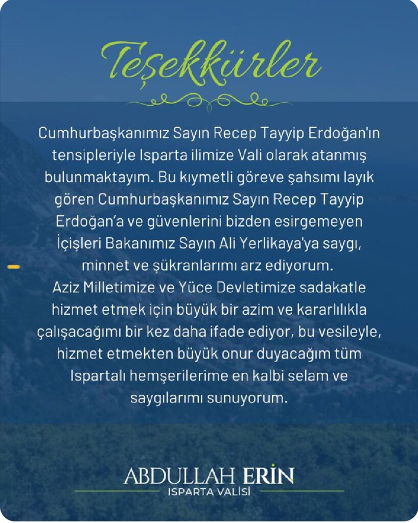 “Cumhurbaşkanımızın tensipleriyle Isparta ilimize Vali olarak atanmış bulunmaktayım. Bu göreve şahsımı layık gören Cumhurbaşkanımız Sayın Recep Tayyip Erdoğan’a, güvenlerini bizden esirgemeyen İçişleri Bakanımız Sayın Ali Yerlikaya’ya saygı, minnet ve şükranlarımı arz ediyorum.” ifadelerini kullandı.