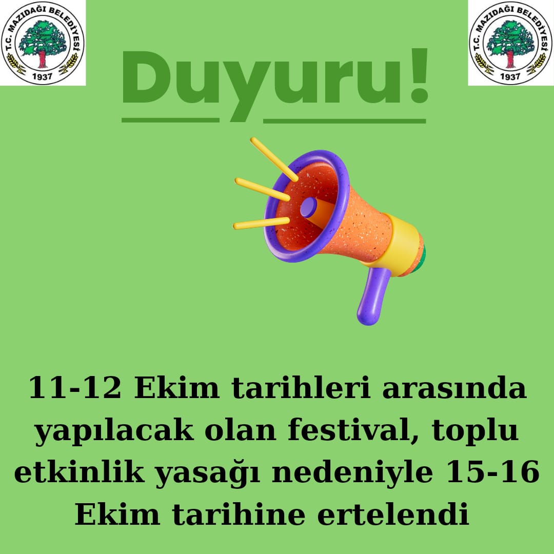 Mazıdağı Belediyesi ve Sanatça Organizasyon tarafından Mazıdağı’nda 11-12 Ekim tarihleri arasında gerçekleştirilecek olan Kadın Kültür Sanat Festivali, Mazıdağı Belediyesi tarafından yapılan açıklama ile ertelendiği kaydedildi. Açıklamada Mazıdağı Cumhuriyet Meydanı’nda 2 gün boyunca resim sergisi, denbêj divanı ve konserlerle bir dizi etkinliğin yapılması planlandığı festivalin, Mardin Valiliği’nin toplu etkinlik yasağı gerekçesi ile ertelendiği kaydedildi. Karara ilişkin Mazıdağı Belediyesi, açıklamanın devamında ertelenen Kadın Kültür Sanat Festivali’nin 15-16 Ekim’de yapılacağını aktardı.