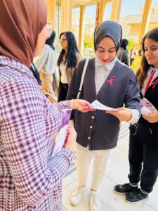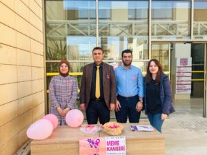 Mardin Artuklu Üniversitesi Kampüs alanında meme kanseri farkındalık standı açan Sağlık Bilimleri Fakültesi Hemşirelik bölümü öğrencileri meme kanseri ve erken teşhis konularını içeren bilgilendirici broşürler ve farkındalığın simgesi olarak pembe kurdeleler dağıttı.