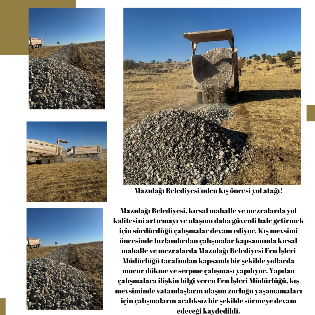 Kış mevsimi öncesinde hızlandırılan çalışmalar kapsamında kırsal mahalle ve mezralarda Mazıdağı Belediyesi Fen İşleri Müdürlüğü tarafından kapsamlı bir şekilde yollarda mucur dökme ve serpme çalışması yapılıyor. Yapılan çalışmalara ilişkin bilgi veren Fen İşleri Müdürlüğü, kış mevsiminde vatandaşların ulaşım zorluğu yaşamamaları için çalışmaların aralıksız bir şekilde sürmeye devam edeceği kaydedildi.