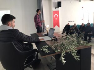 İlçe Tarım ve Orman Müdürü Nevaf Kalkan ve Yüksek Ziraat Mühendisi Özkan Gökalp zeytin üreticilerinin sordukları soruları cevaplandırdı.