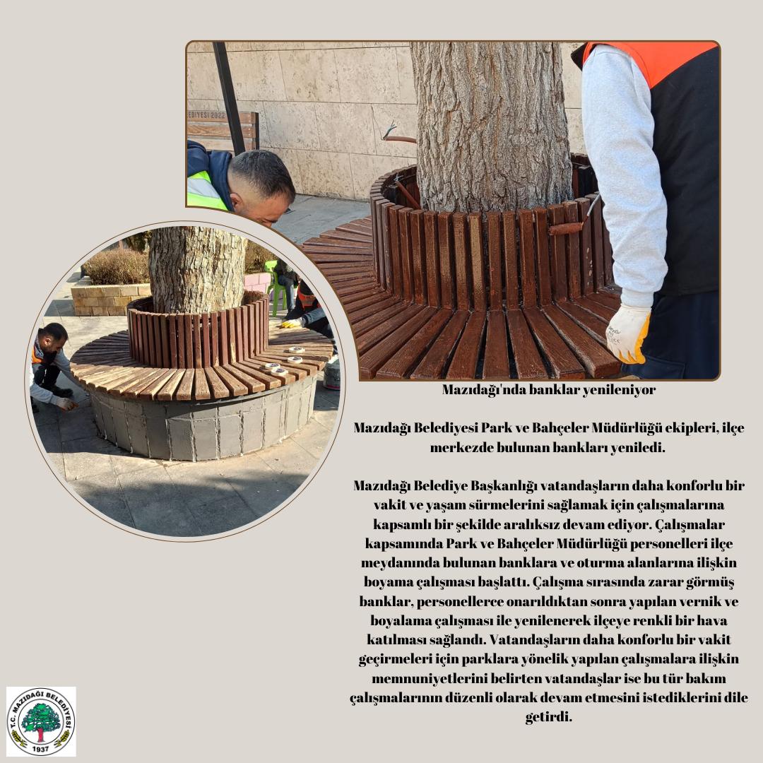 Mazıdağı Belediye Başkanlığı vatandaşların daha konforlu bir vakit ve yaşam sürmelerini sağlamak için çalışmalarına kapsamlı bir şekilde aralıksız devam ediyor. Çalışmalar kapsamında Park ve Bahçeler Müdürlüğü personelleri ilçe meydanında bulunan banklara ve oturma alanlarına ilişkin boyama çalışması başlattı. Çalışma sırasında zarar görmüş banklar, personellerce onarıldıktan sonra yapılan vernik ve boyalama çalışması ile yenilenerek ilçeye renkli bir hava katılması sağlandı. Vatandaşların daha konforlu bir vakit geçirmeleri için parklara yönelik yapılan çalışmalara ilişkin memnuniyetlerini belirten vatandaşlar ise bu tür bakım çalışmalarının düzenli olarak devam etmesini istediklerini dile getirdi.