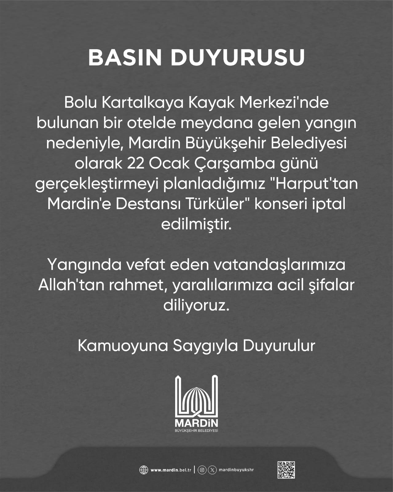Bolu Kartalkaya Kayak Merkezi’nde bulunan bir otelde meydana gelen yangın nedeniyle, Mardin Büyükşehir Belediyesi olarak 22 Ocak Çarşamba günü gerçekleştirmeyi planladığımız “Harput’tan Mardin’e Destansı Türküler” konseri iptal edilmiştir.