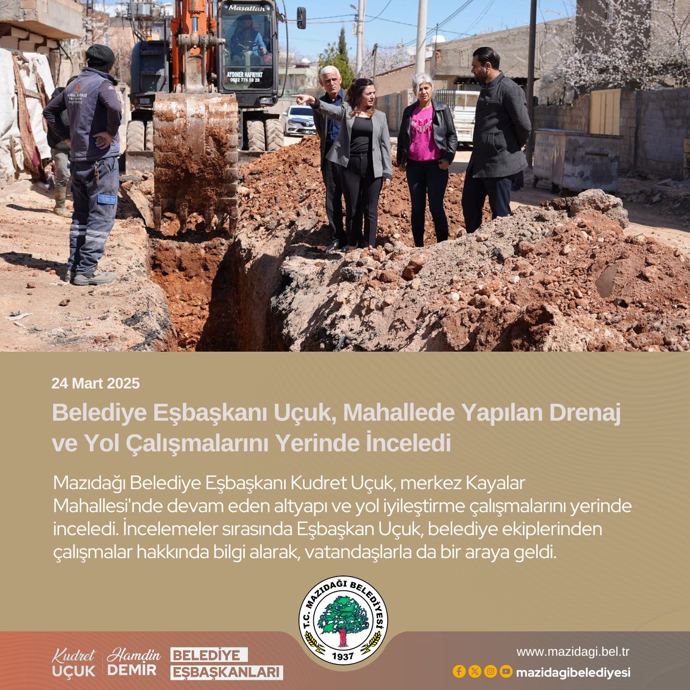 Mahalledeki yol yapım ve drenaj hattı döşeme çalışmalarının hızla devam ettiğini belirten Eşbaşkan Uçuk, “Mahalle sakinlerimizin yaşam kalitesini artırmak için altyapı ve yol çalışmalarımızı sürdürüyoruz. Yağışlı havalarda su birikintilerinin önüne geçebilmek amacıyla yapılan drenaj çalışmaları, uzun vadede mahallemizin sorunlarını çözecek önemli adımlar arasında yer alıyor. Aynı zamanda yol düzenlemeleri ile ulaşımı daha güvenli ve konforlu hale getirmeyi hedefliyoruz. Gerek altyapı, gerekse yol düzenlemeleri konusunda halkımızın taleplerini dikkate alarak, modern ve sürdürülebilir projelerle hizmet vermeyi sürdüreceğiz” dedi.