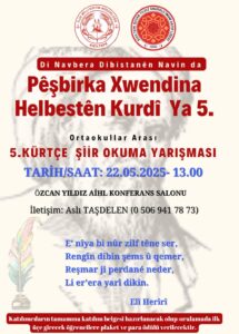 Özcan Yıldız Anadolu İmam Hatip Lisesi’nin düzenlemiş olduğu Ortaokullar arası Kürtçe Şiir Okuma yarışmasının beşincisinin 22 Mayısta yapılacağı açıklandı. Okulun konferans salonunda yapılması planlanan yarışma için tweetter hesabında yapılan çağrıda iletişim için Aslı Taşdelen 05069417873 nolu telefon ile irtibata geçilmesi belirtildi.