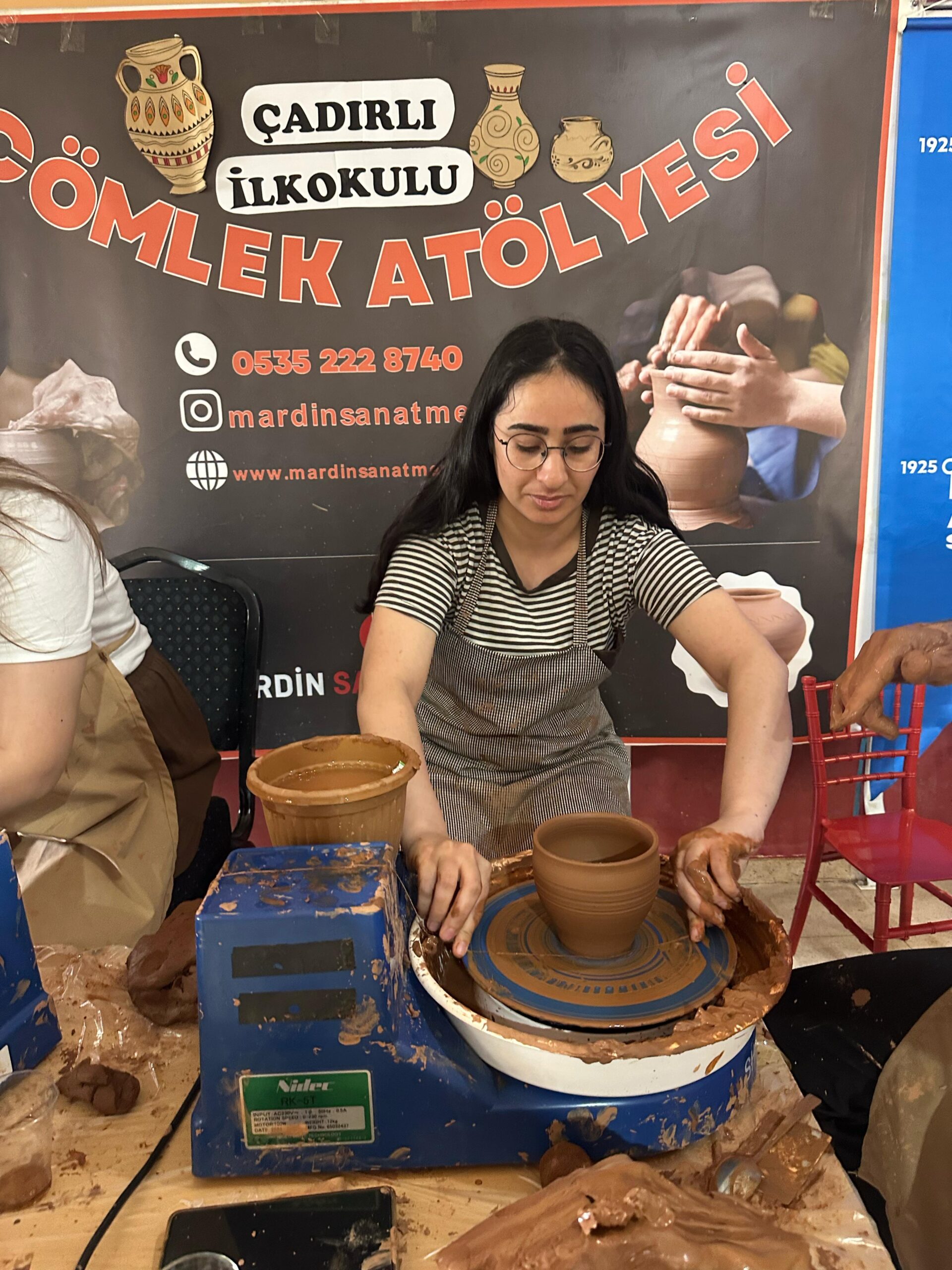 MEB tarafından yürütülen ‘Maarif Eğitim Programı’ kapsamında, Derik ilçesine 25 kilometre uzaklıktaki kırsal Çadırlı İlk ve Ortaokulu’ndaki 100 öğrenciye yönelik etkinlik gerçekleştirildi. Okulun sanat atölyesinde okul yönetimi, öğretmen ve velilerin iş birliğiyle organize edilen etkinlikte öğrenciler, ilk kez çömlekçilik ile tanıştı. Çömlek yapım süreci, kil şekillendirme, modelleme ve tornada çömlek yapma gibi temel teknikler, çömlek sanatçıları usta öğreticiler Nurettin ve Agrin Çakmak tarafından öğrencilere uygulamalı olarak anlatıldı. Eğitim sürecinin ardından öğrenciler, torna başına geçerek kendi çömleklerini yapma fırsatı buldu. Ortaya çıkan el emeği ürünler ise okulda sergilendi. Etkinliğin kültürel değerleri yaşatmayı ve öğrencilere sanatı tanıtmayı hedeflediğini belirten Okul Müdürü Engin Aktaş, “Etkinliğe okulumuzda 100 öğrencimiz katıldı. Yaparak ve yaşayarak yapılan bir etkinlik olduğu için çok daha verimli oldu. Öğrencilerin bu konuda ilgisi daha çok arttı. Hem velilerimizden hem öğrencilerimiz bayağı ilgi gördü. Bu etkinliklerin kırsal mahallelerde yapılması çok daha sağlıklıdır. Öğrencilerin, okula olan bağlılığını da arttırmasında faydalı olmaktadır” dedi.