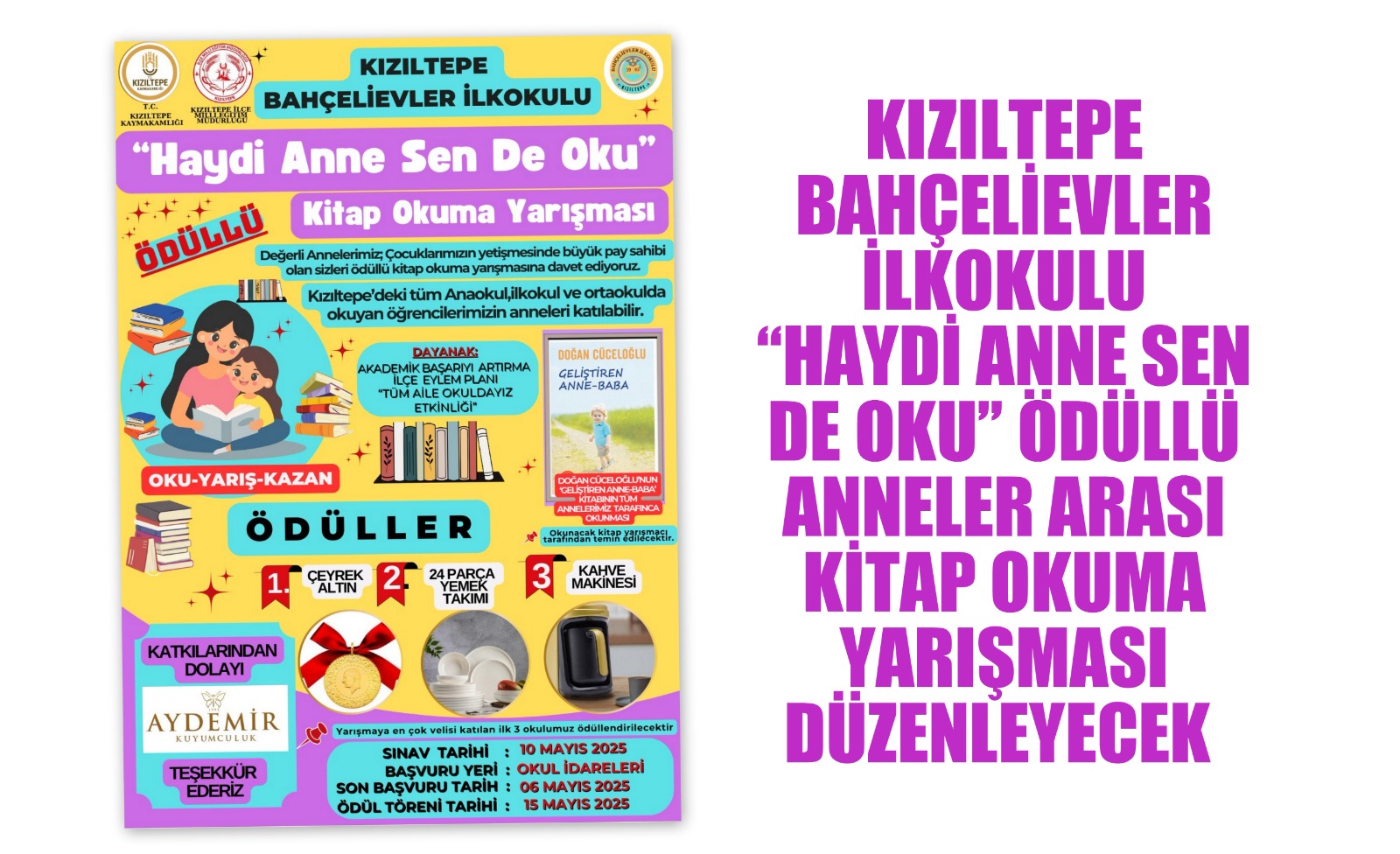 Kızıltepe Bahçelievler İlkokulu tarafından düzenlediği, ““Haydi Anne Sen De Oku “sloganıyla gerçekleştireceği Kitap Okuma Yarışması, 10 Mayıs 2025 Cumartesi günü yapılacak.
