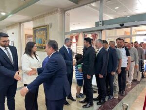 Gelen misafirleri kapıda, AK Parti İl Başkanı Mehmet Uncu, AK Parti Mardin Milletvekili Faruk Kılıç, AK Parti İl Kadın Kolları Başkanı Esra Ayanoğlu Özdaş, AK Parti İl Gençlik Kolları Başkanı Süheyl Uçar ve AK Parti İl Yönetim Kurulu Üyeleri tarafından kapıda tek tek karşılanarak bayramları tebrikleri kabul ettiler.