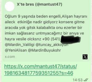 X sosyal medya platformunda “bres” kullanıcı adlı bir vatandaş, paylaşımında “Oğlum 9 yaşında beden engelli, Alişan hayranı. Ailecek etkinliğe nadiren gidiyoruz, konsere gitmek isteriz ama aracımız yok. Gitsek kalabalıkta onu ezerler. Bir imkân sağlasanız unutamayacağımız bir anıya ve hayra vesile olacaksınız” ifadeleriyle çağrıda bulundu.