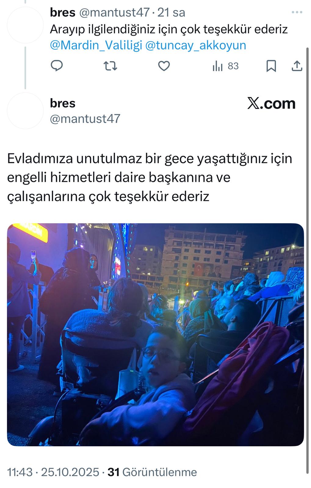 Paylaşımı gören Mardin Valisi ve Büyükşehir Belediye Başkan Vekili Tuncay Akkoyun, ailenin talebine anında karşılık vererek, Mardin Büyükşehir Belediyesi Engelli ve Yaşlı Hizmetleri Daire Başkanlığı’na çocuğun konsere götürülmesi talimatını verdi.