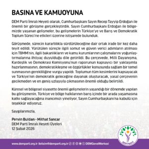 Terörsüz Türkiye sürecinde, Cumhurbaşkanı Erdoğan dün DEM Parti İmralı Heyetini kabul etmiş, heyette Pervin Buldan ve Mithat Sancar yer almıştı. Bu kapsamda DEM Parti, dünkü görüşmeye ilişkin bir açıklama yayınladı. Açıklamada şu ifadeler yer aldı: