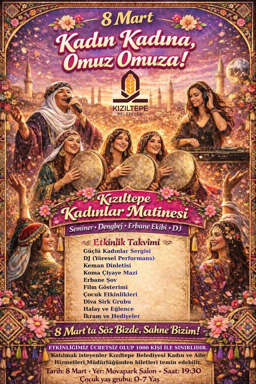 Etkinlik, 8 Mart Cumartesi günü saat 19.30’da Mova Park Salon’da gerçekleştirilecek. Ücretsiz olarak düzenlenecek programa katılım 1000 kişi ile sınırlı olacak. Katılmak isteyenler, biletlerini Kızıltepe Belediyesi Kadın ve Aile Hizmetleri Müdürlüğü’nden temin edebilecek.