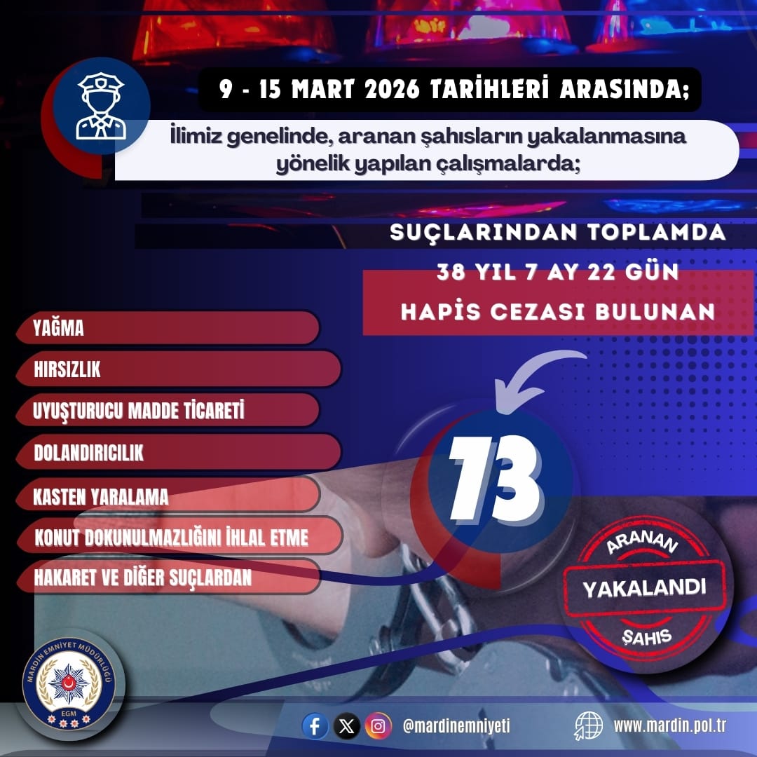 9 Mart – 15 Mart 2026 tarihleri arasında yapılan çalışmalarda, çeşitli suçlardan aranması bulunan toplam 73 şahıs yakalandı. Yakalananlar arasında;