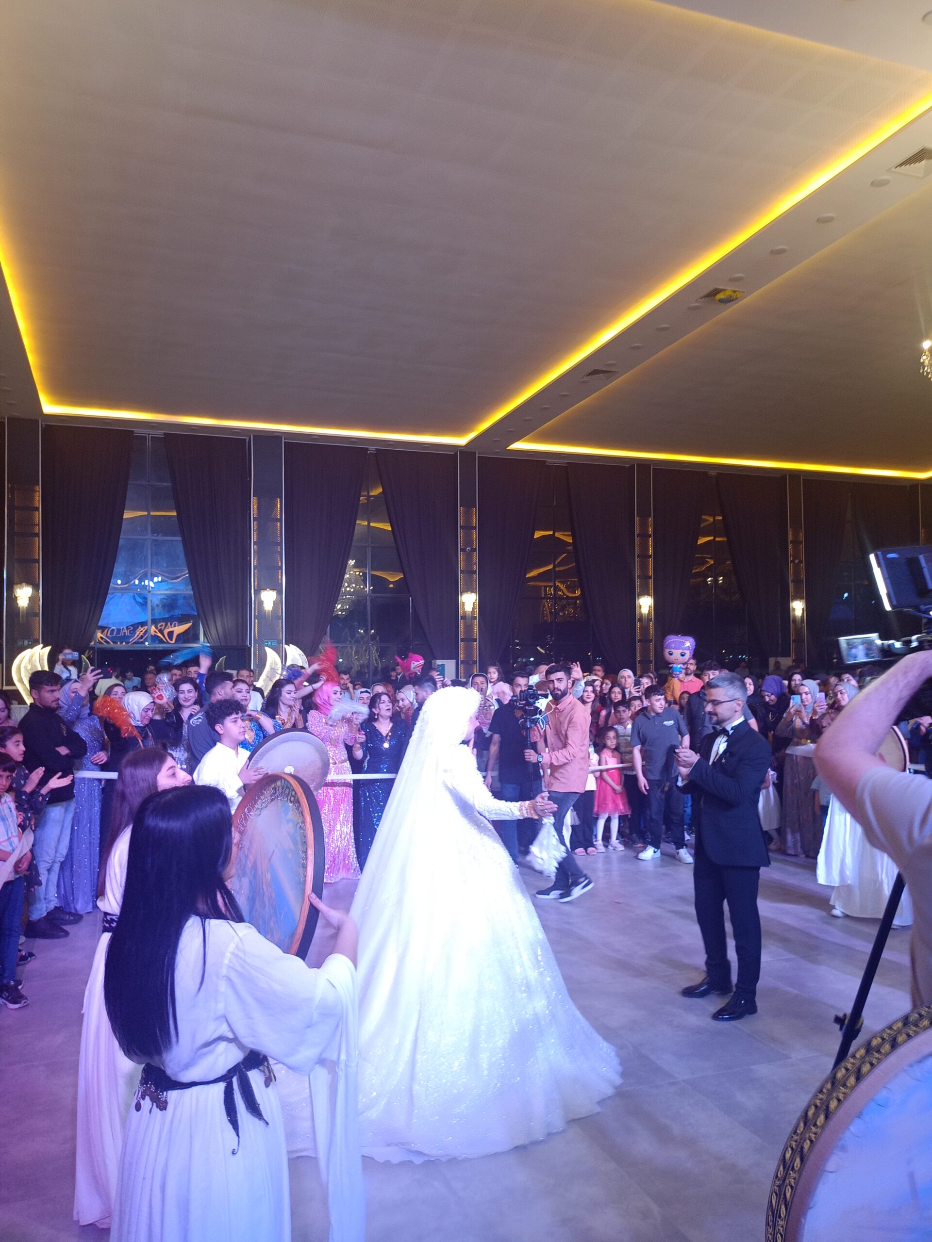 Düğün Kızıltepe’de Dara Düğün salonunda, halk sanatçısı Ozan Ferhat’ın güzel sesi ve birbirinden güzel helbestlerin eşliğinde yapıldı. Gelin ve damat halk müziğinin etkileyici enstrümanı olan Erbane ekibinin şahane gösterisi eşliğinde ve geceyi aydınlatan ışıkların ambiyansı ortamında düğün salonuna girdiler. Gelin ve damadın salona girmesiyle kadınların zılgıtları düğün salonunu sarsttı adeta.
