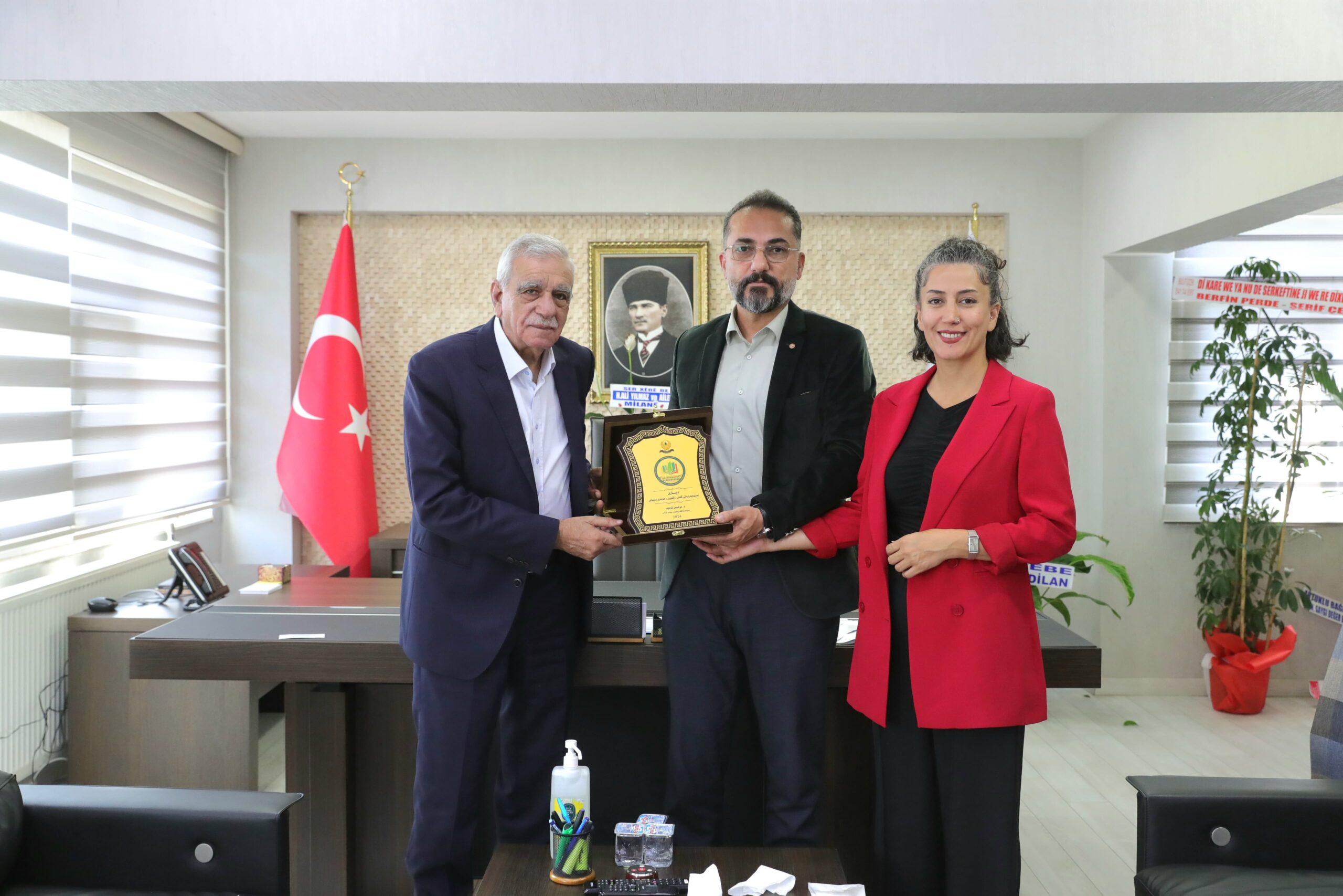 Bir dizi temasta bulunmak için Mardin’e gelen Süleymaniye Kültür ve Sanat Genel Müdürü Dr. Muhsin Adip, ziyaretleri kapsamında Mardin Büyükşehir Belediye Eş Başkanları Devrim Demir ve Ahmet Türk ile görüştü. Eş Başkanlar Devrim Demir ve Ahmet Türk’ü belediye makamlarında ziyaret eden Dr. Muhsin Adip, eş başkanlara hayırlı olsun dileklerini ileterek, kurumları adına eş başkanlara plaket takdim etti. Plaket takdimi sırasında eş başkanlar ile Dr. Muhsin Adip birlikte fotoğraf çektirdi.