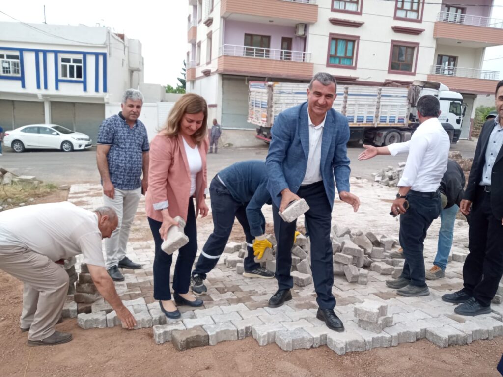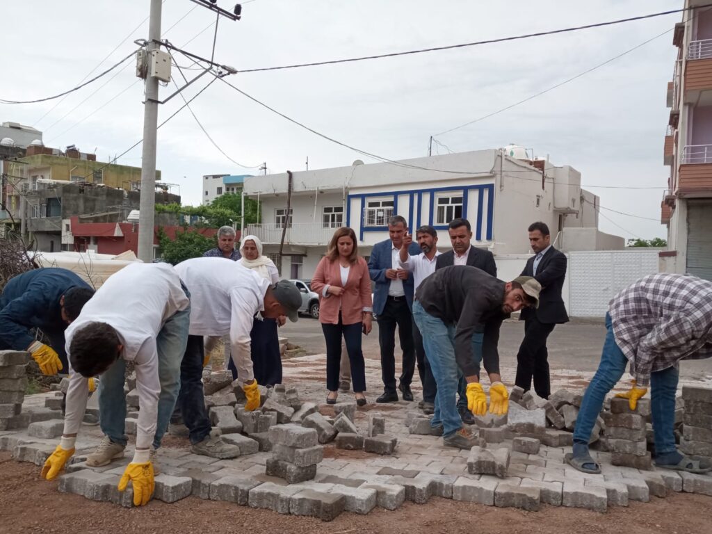 Derik Belediyesi Eş başkanları Songül Özbahçeci ve Cengiz Temelli, ilçeye bağlı mahallelerde devam eden kilitli parke taşı çalışmalarını yerinde inceledi.