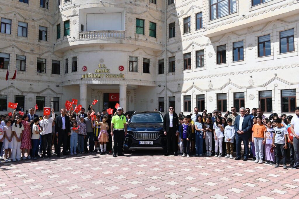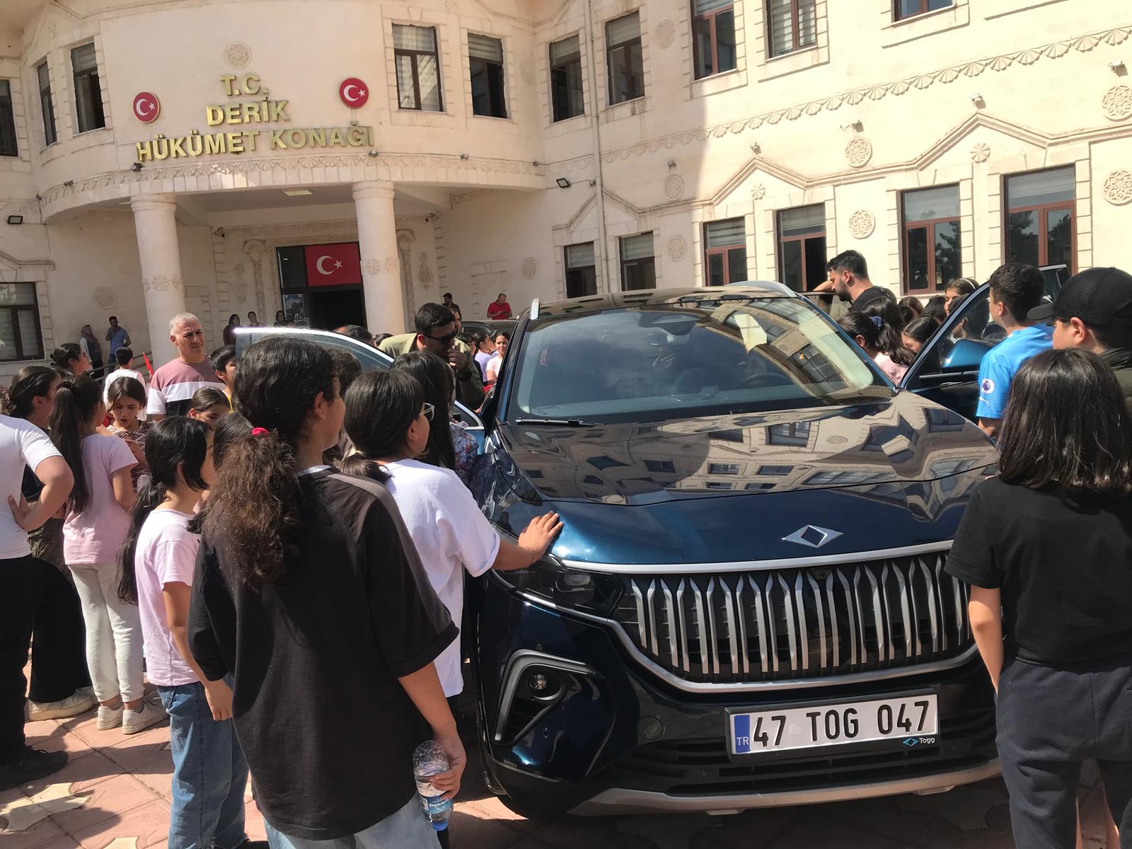 Derik İlçesinde Mardin Valiliği’nin desteğiyle ülkenin yerli ve Milli ilk üretilen Togg aracı vatandaşların gösterimine sunuldu.İlçe Kaymakamı Evren Çakır,İlçe Jandarma Komutanı Mevlid Taş,İlçe Emniyet Müdürvekili İsmail Şanlı,Kurum Amirleri ile öğrenci ve vatandaşların katılımıyla ‘Hayatla Yarışılmaz-Yayalar kırmızı çizgimiz’şiarıyla kutlanan etkinliğe Togg arac damgasını vurdu,İlçe halkının görebilmesi için araç, Hükümet Konağı bahçesinden yaklaşık bir kilometre mesafede, programa katılanların aracın arkasında yürüyerek,ilçe halkına tanıtılması amacıyla araç hareket ederken arkasında da yürüyerek Kale mahallesinde bulunan bir petrol istasyonuna kadar devam etti.Benzinlik İstasyonunda Jandarma’ya ait Bomba arama Saka adlı köpeği gösterilerde bulunurken, Togg araca öğrenciler guruplar halinde bindirilerek tanıtımı yapıldı ve Trafik Komiseri Erdi Yıldırım öğrencilere trafik kuralları hakkında bilgiler verirken,program sonunda bilgilendirme amaçlı öğrencilere ‘Trafik Jandarması okul yolunda’ adlı kitapçıklar hediye edilerek program sona erdi.