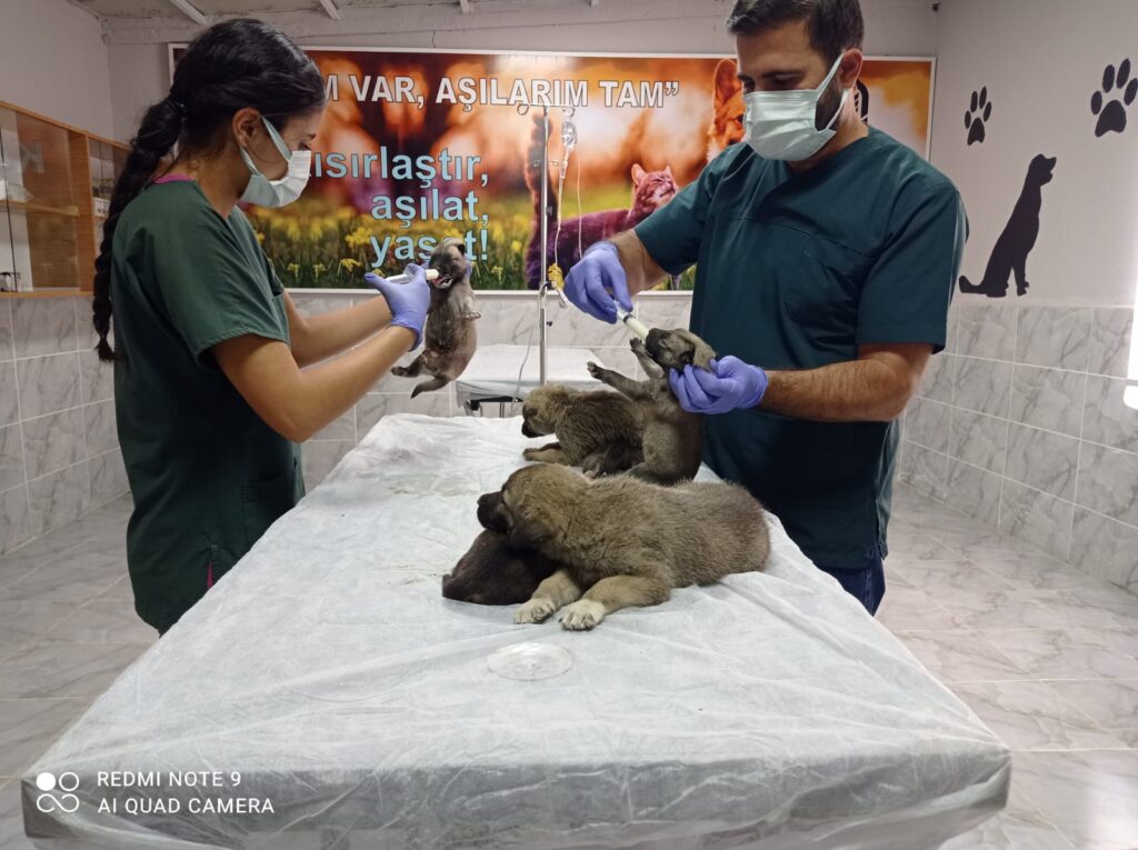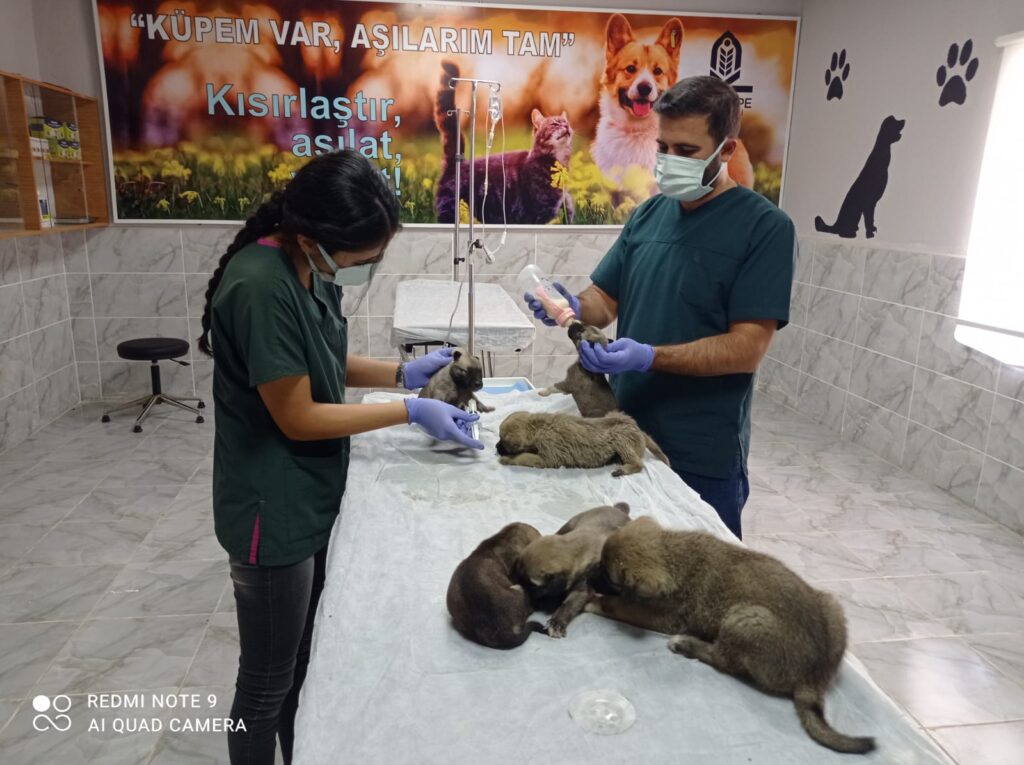 Kızıltepe Belediyesi’nin veterinerleri ve sağlık teknikerleri, sahipsiz kalan yavru köpeklerin aşılarını yaptıktan sonra sütle besledi.