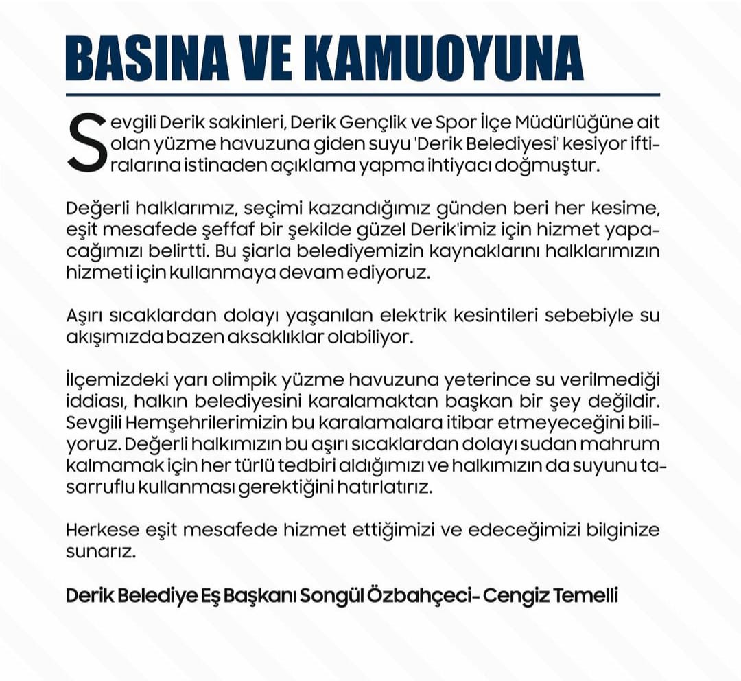 Sevgili Derik sakinleri, Derik Gençlik ve Spor İlçe Müdürlüğüne ait olan yüzme havuzuna giden suyu ‘Derik Belediyesi’ kesiyor iftiralarına istinaden açıklama yapma ihtiyacı doğmuştur.