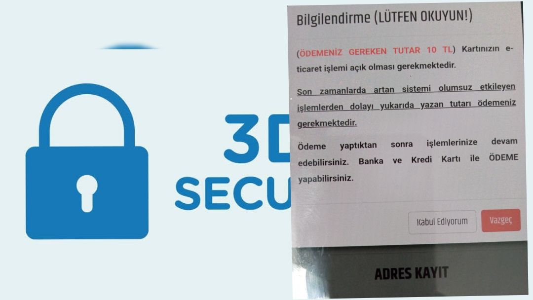“(ÖDEMENİZ GEREK TUTAR 10 TL) Kartınızın e-ticaret işlemi açık olması gerekmektedir. Son zamanlarda artan sistemi olumsuz etkileyen işlemlerden dolayı yukarıda yazan tutarı ödemeniz gerekmektedir. Ödeme yaptıktan sonra işlemlerinize devam edebilirsiniz. Banka ve Kredi Kartı ile ÖDEME yapabilirsiniz.”